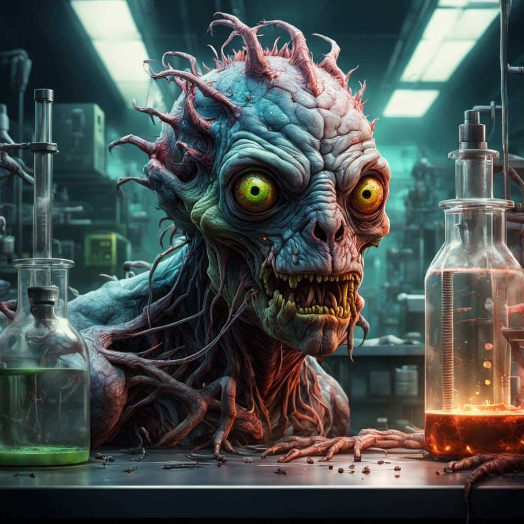 This image shows a grotesque mutant creature in a laboratory setting. The hyperrealistic rendering features body horror elements and scientific equipment, set against a colorful background. The image is splash art style.