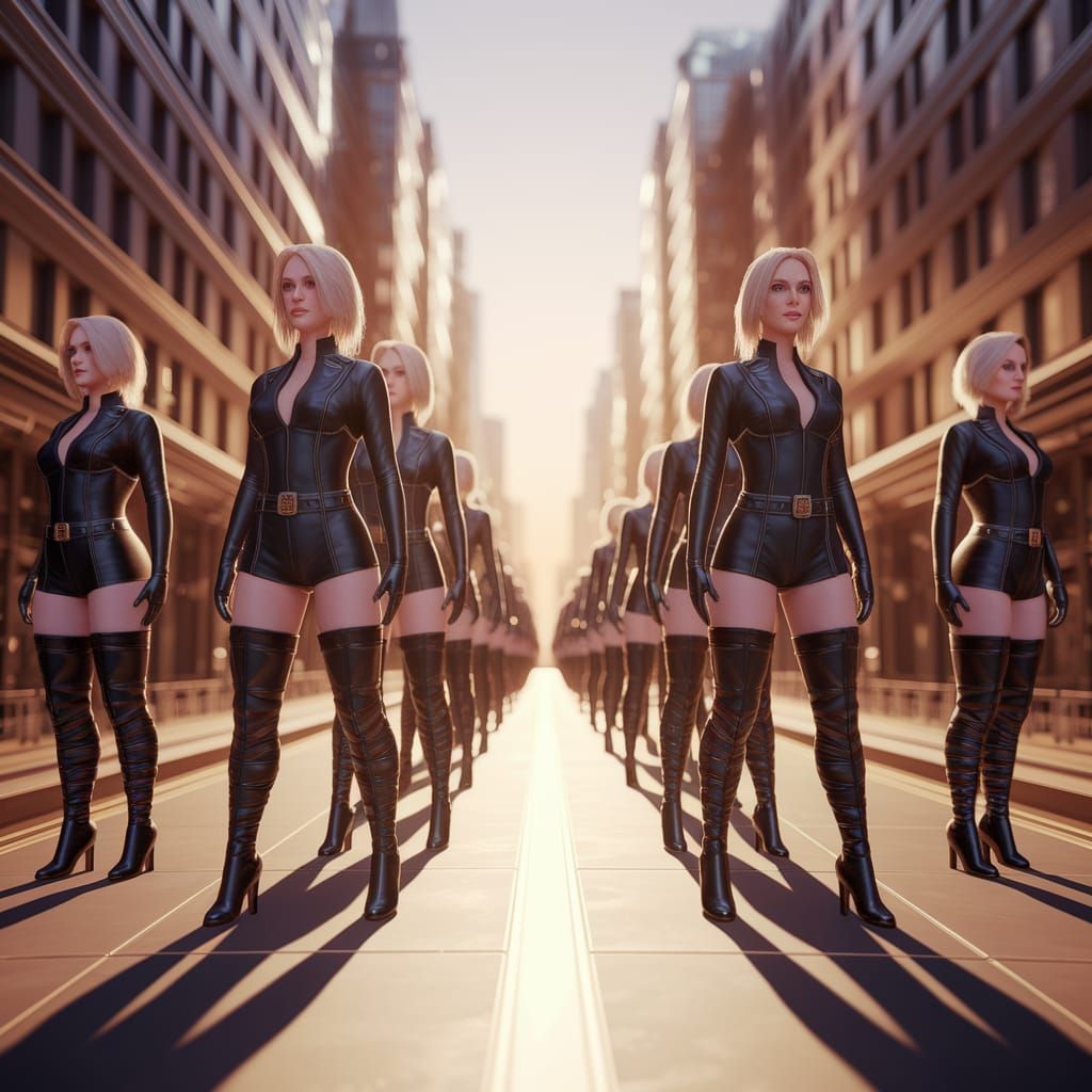 This 3D game cinematic art features several Nicole Kidman clones standing guard in a sun-kissed cityscape, clad in sleek black leather uniforms and knee-high boots, rendered with epic videogame graphics and HDR effects.