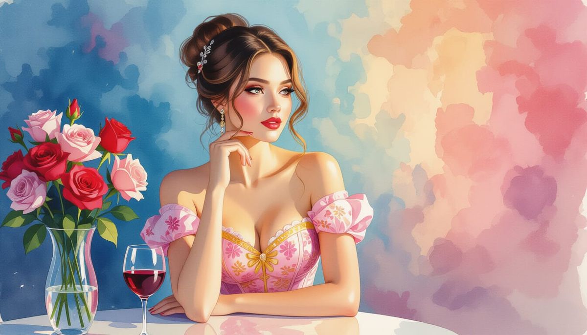 A woman in a pink and gold floral corset dress meditates at a table with roses and wine. The background features a vibrant, abstract gouache mix, creating a dreamy, romantic feel.