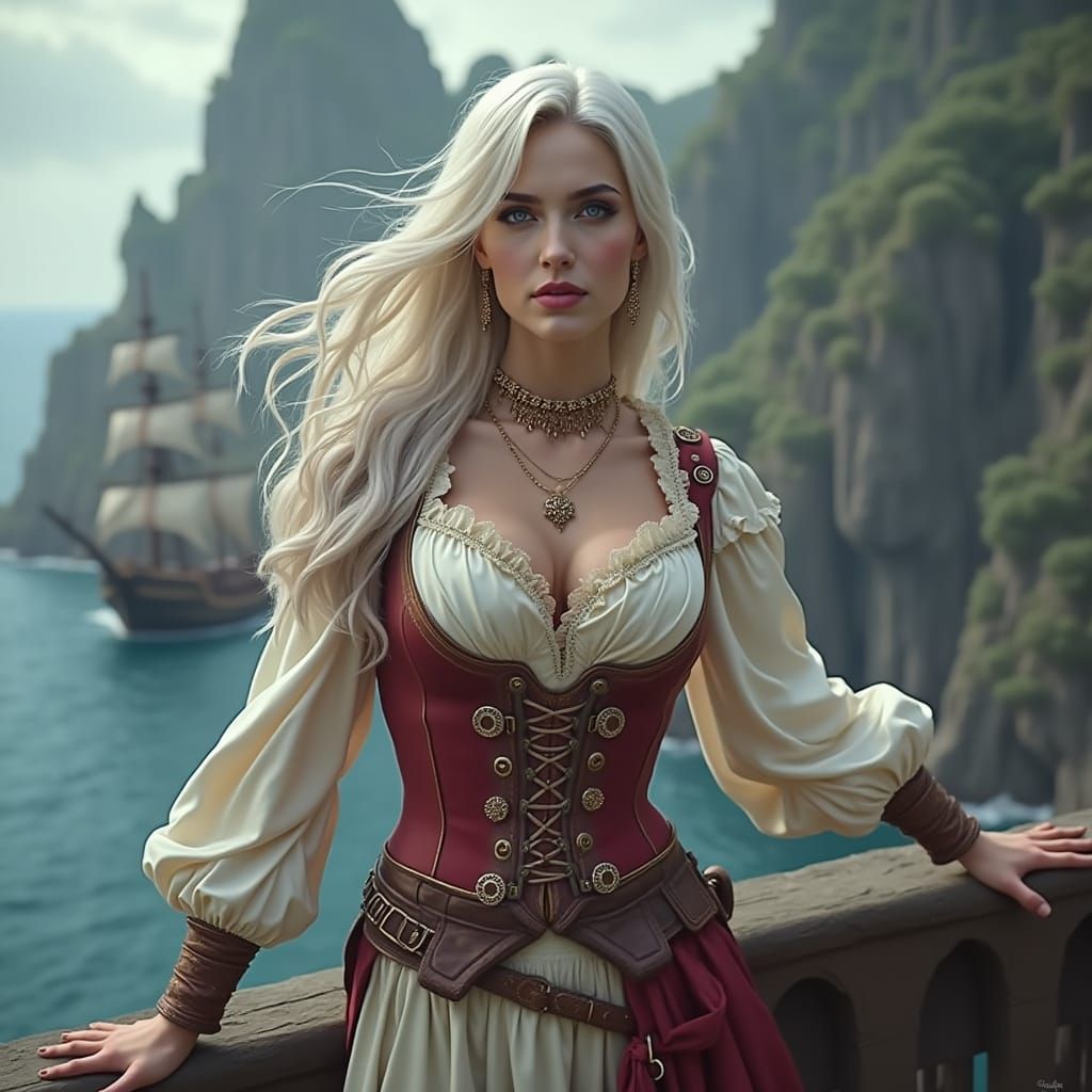 This image shows a powerful woman standing heroically against a dramatic moonlit ocean backdrop, with a shipwreck in the distance and intricate clouds. Rendered in a stunning digital matte painting style, with vivid colors and textures reminiscent of epic cinematic art.