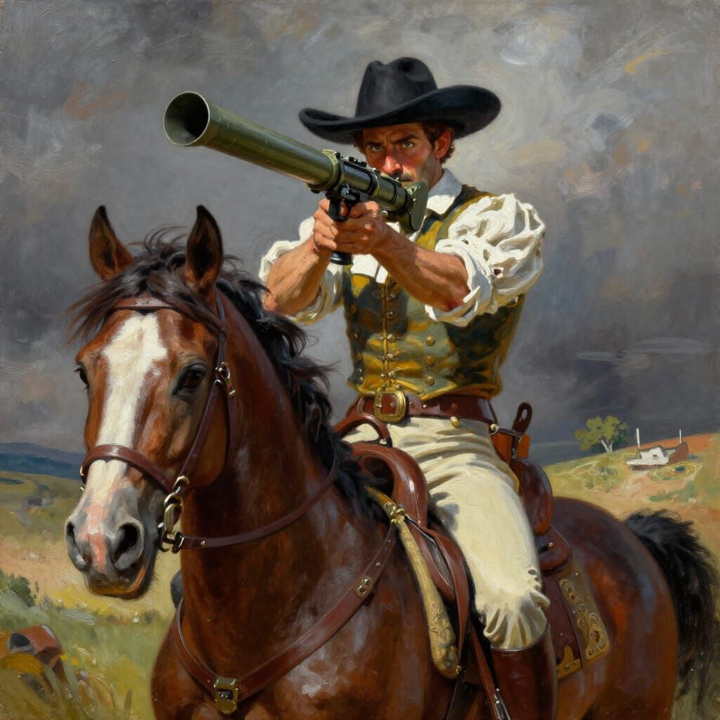 This image depicts Don Quijote on horseback, wielding a rocket launcher, in the rich, textured style of James Gurney's oil paintings. Dramatic lighting and vibrant colors create a heroic fantasy scene with a sense of action.