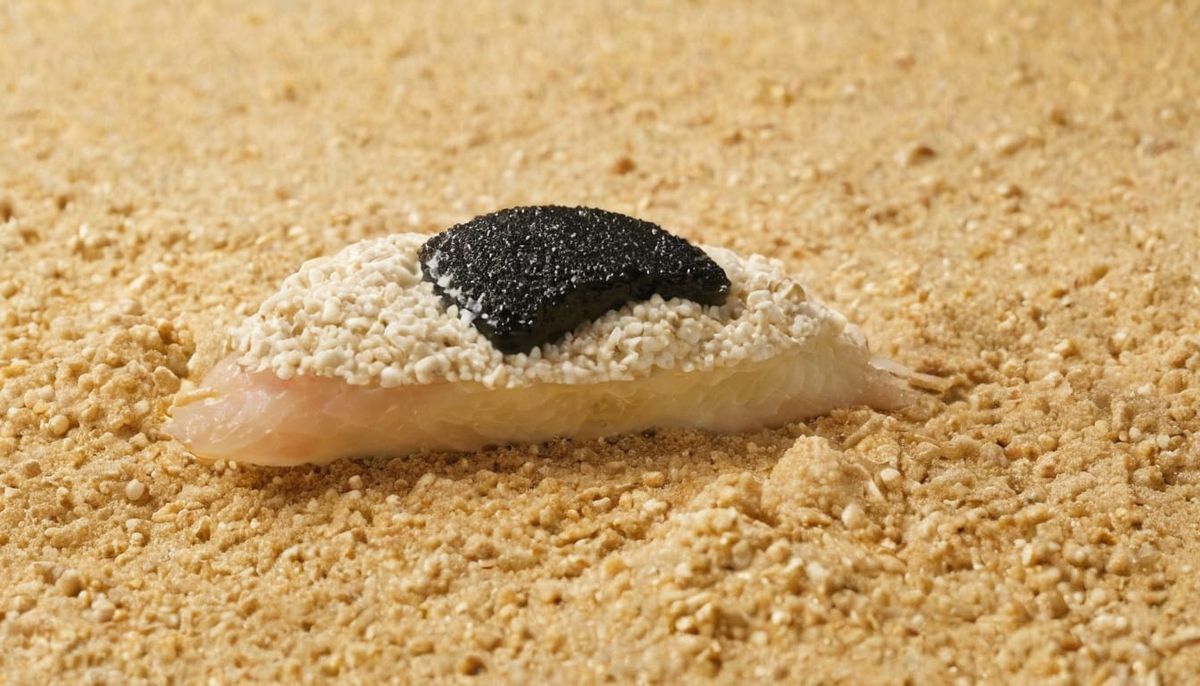 This image showcases a playful, dreamlike scene featuring sand sushi, blending the mundane with the fantastical in a style reminiscent of surrealist art.
