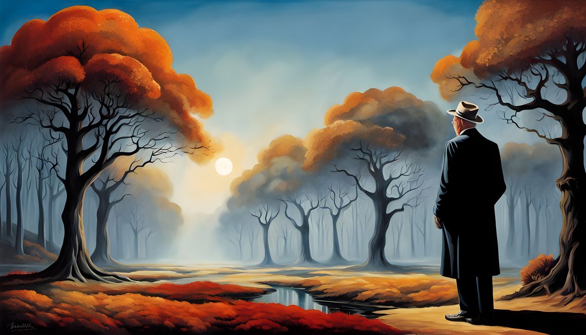 A striking picture of an elderly man set within a surreal landscape. Intense, vibrant colors and photorealistic rendering create a dreamlike, otherworldly scene in a surrealist style.