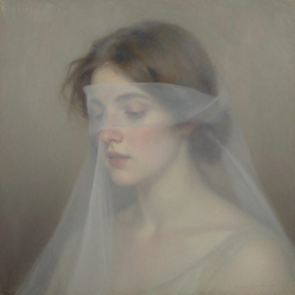 This image showcases a soft, ethereal portrait of a veiled woman. Diffused light creates a gentle chiaroscuro, evoking mystery and emotion in a dreamlike oil painting style with delicate brushstrokes and a muted palette.