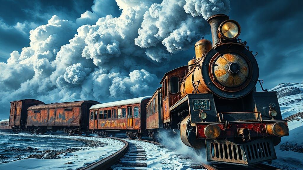 This image features a detailed, 18th-century Victorian train and carriages with rust patina, facing an epic winter storm. The illustration captures dramatic atmospheric tension and cinematic composition.