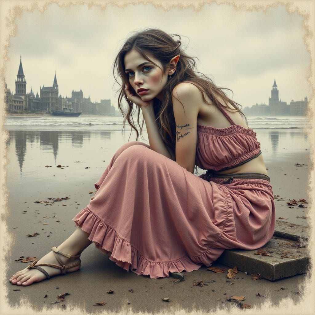 A melancholic elf in a flowing pink dress sits on a rainy beach, captured in a rough, realistic charcoal sketch