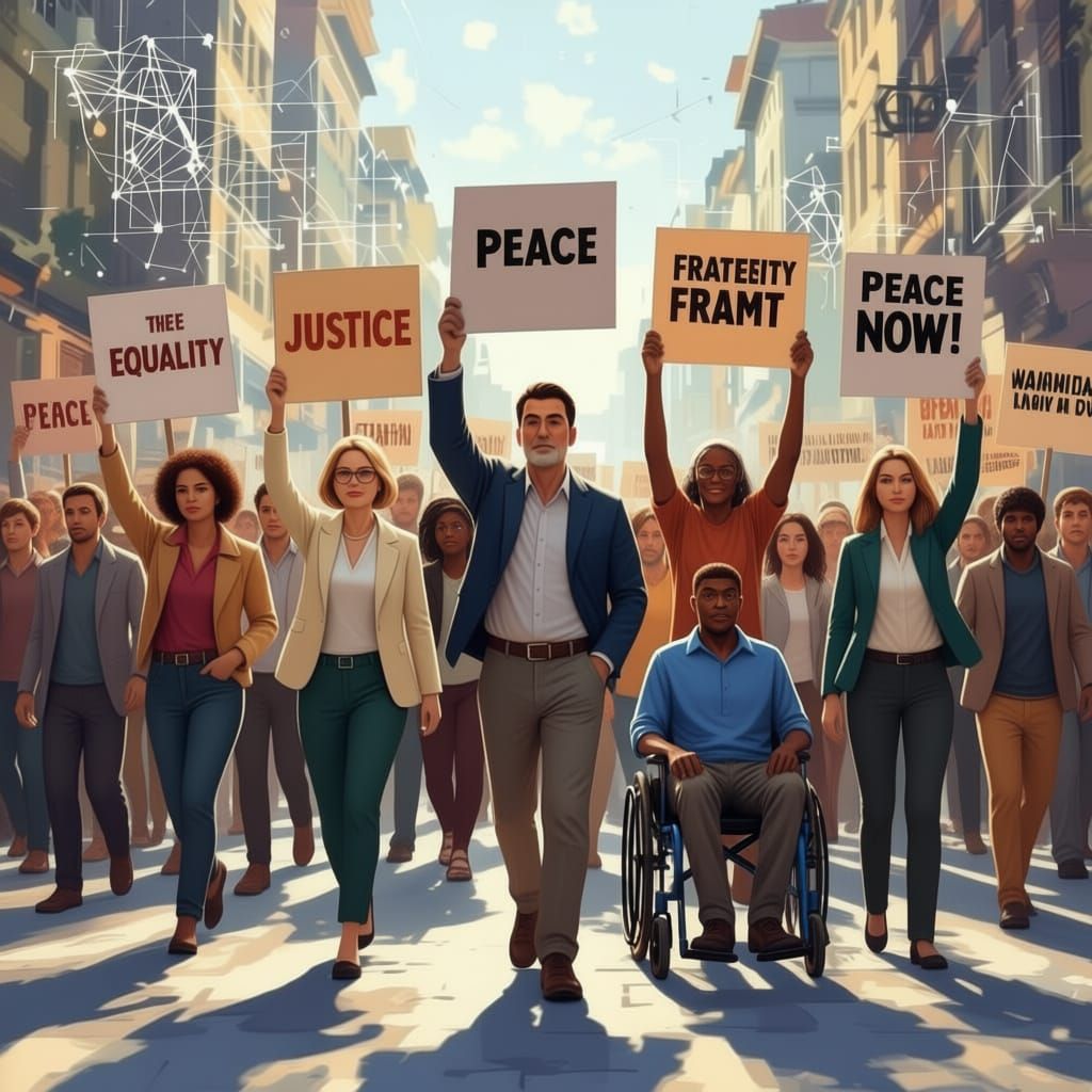 Non-jean wearing older men and women walk around with placards 'Equality' 'Justice' 'Fraternity' 'Peace'.