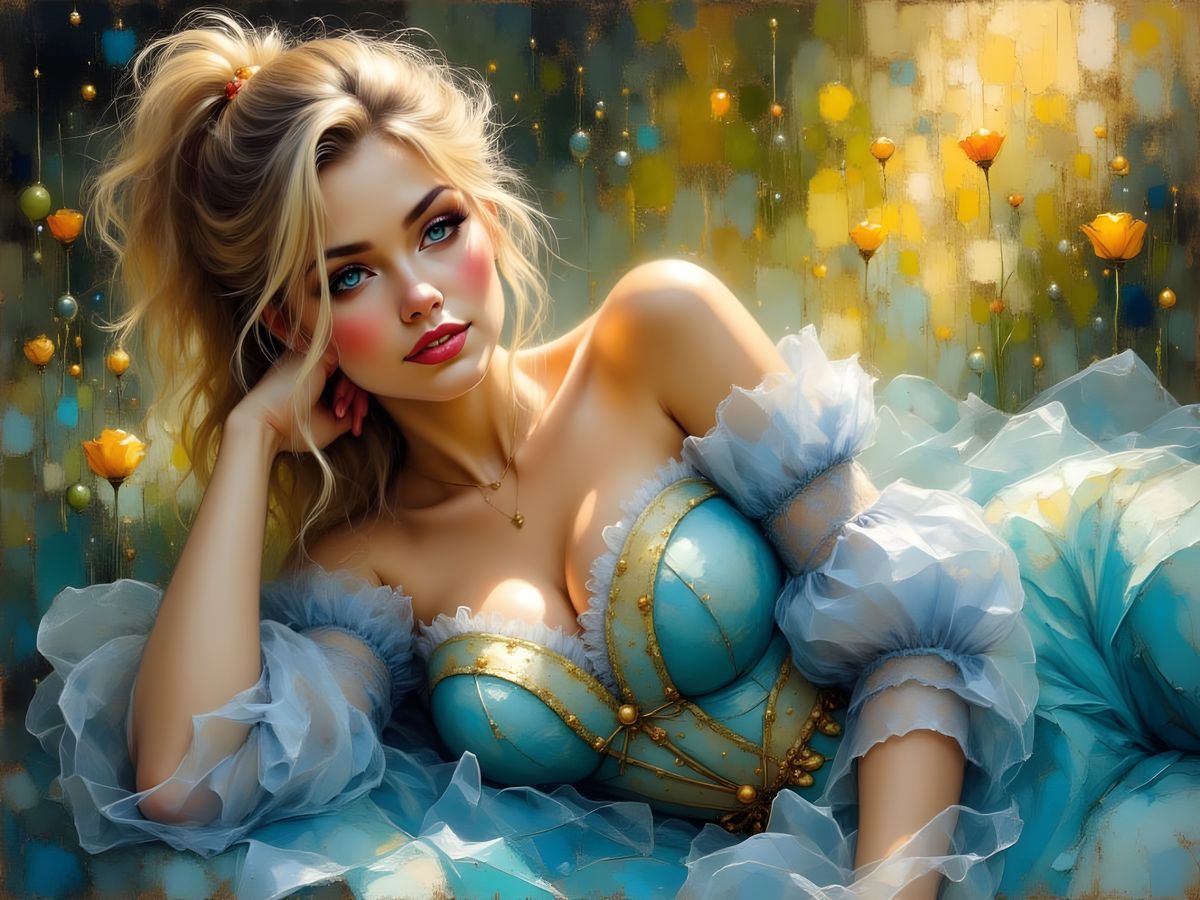 This image shows a beautiful Norse goddess with a blonde ponytail, blue eyes, and a light blue gown, rendered in a vintage impasto style with emerald and gold accents.