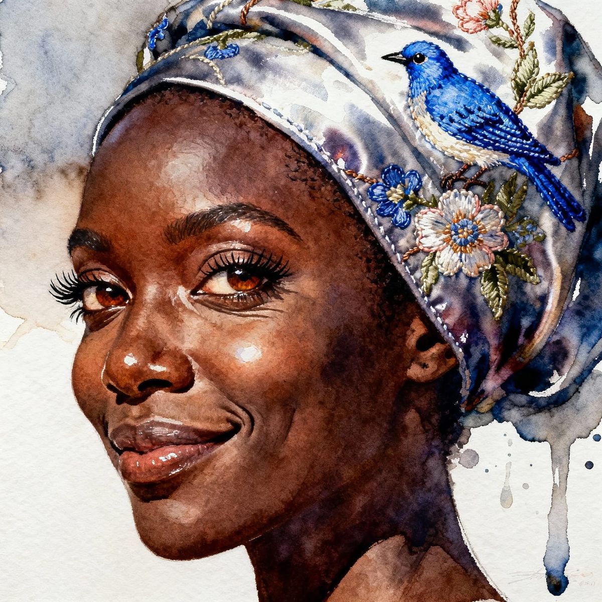 This image showcases a stunning watercolor portrait of a black woman adorned with a detailed silk headscarf featuring stitched bluebirds and flowers. Her expressive brown eyes and subtle smile add depth to the artwork.