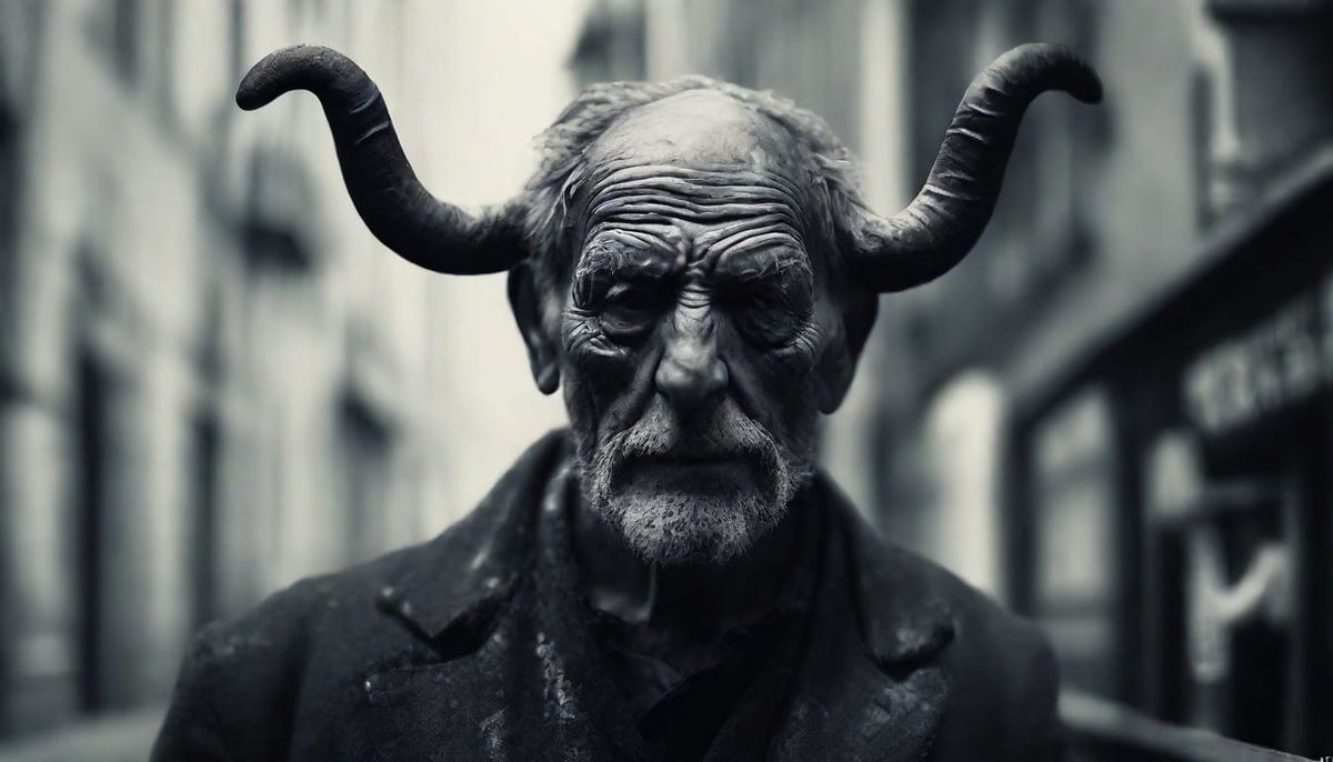 A striking picture of an elderly, hunchbacked man with horns and acne standing alone in a monochromatic street art style. The portrait features intricate details, high contrast shadows, and a deep bokeh background.