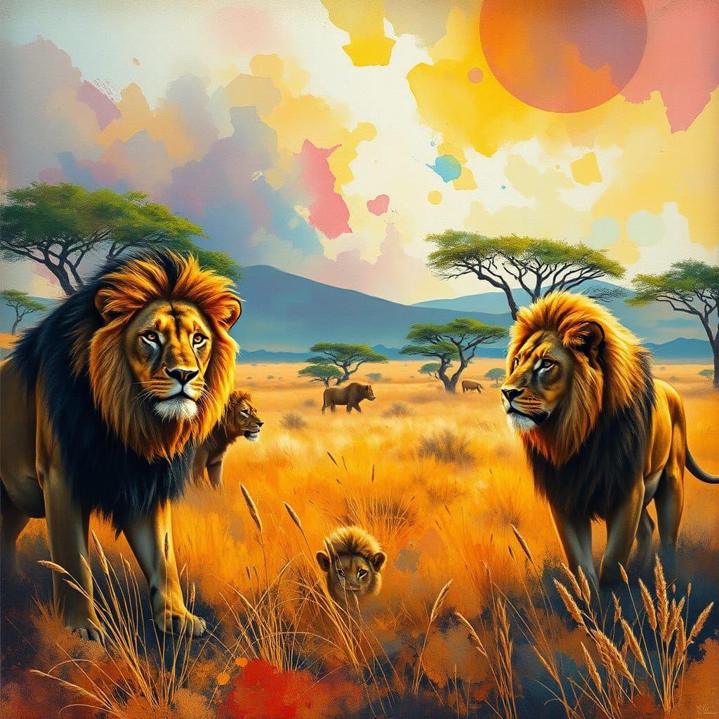 A vibrant image of lions in a savanna landscape. The artwork features charcoal underdrawing, layered with thick, textured gouache and watercolor brushstrokes. The image is rendered with bold impasto and intricate details.