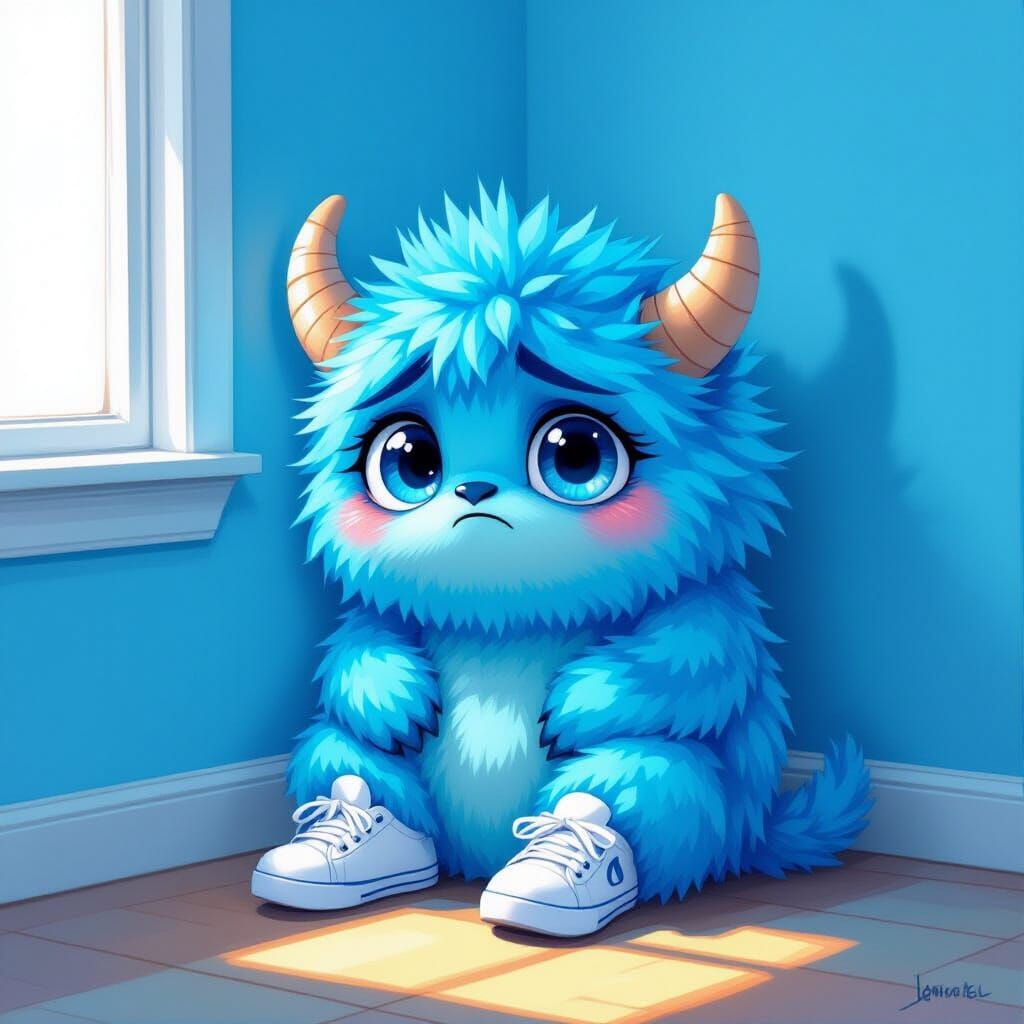 A charming image of a sad blue monster with large eyes sitting in a corner. The scene features soft textures, gentle lighting, and vibrant colors in a whimsical, anime-inspired style.