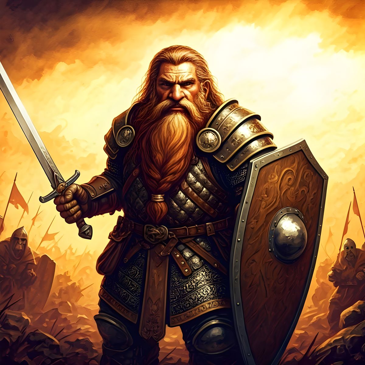 This image depicts a detailed, hyper-realistic depiction of a dwarven warrior in plate armor, wielding a sword and shield, set against a dramatic, atmospheric backdrop of a fantasy battlefield, rendered in a unique blend of ink, watercolor, and digital art techniques.
