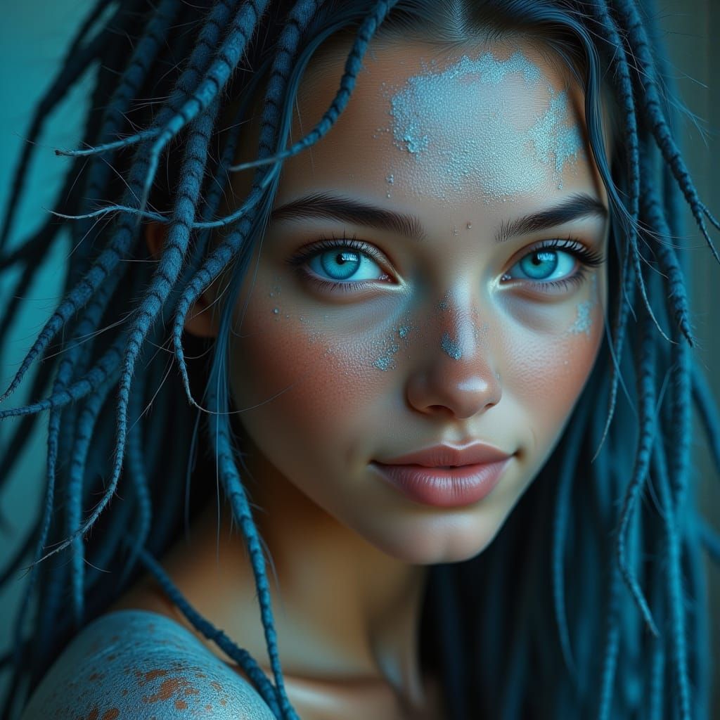 A highly detailed, realistic image of a masculine gynoid idol with tanned skin, blue-grey dreadlocks, and striking blue-steel eyes. Features intricate details, high contrast, and a provocative, confident expression.