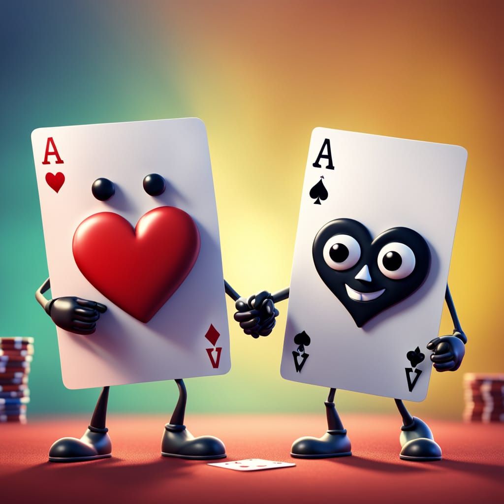 This vibrant image showcases a pair of anthropomorphic aces, one from hearts and the other from spades, holding hands in a whimsical world of poker playing cards, crafted in a unique blend of 3D digital art and cinematic flair.