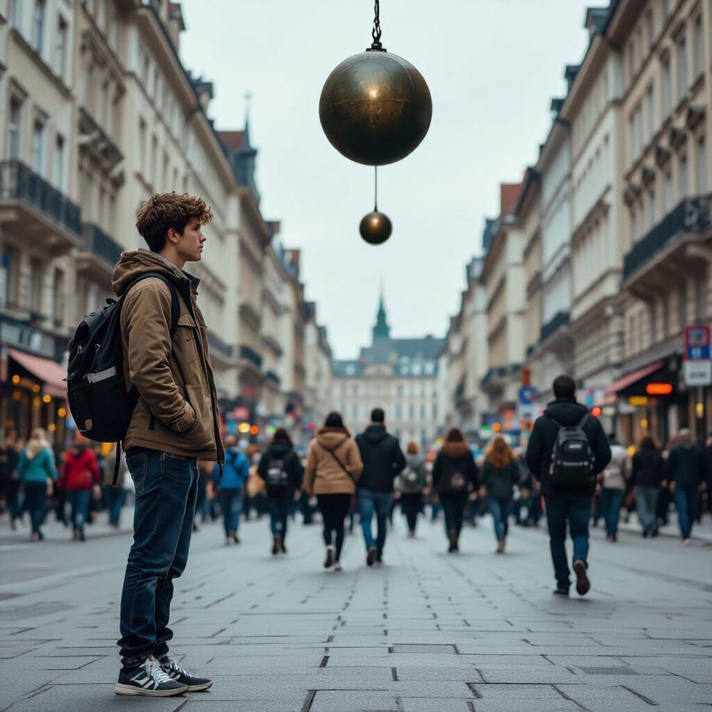 This image shows a young man standing still in a European city as a bomb falls in slow motion behind him, while people flee. The artwork has a gritty, realistic aesthetic.