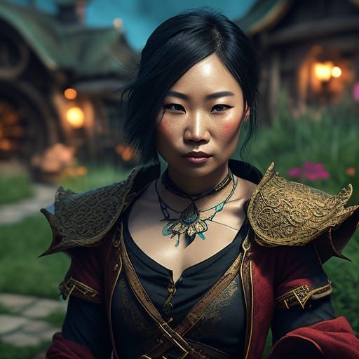 A vibrant portrait of a bald Asian woman in a pirate eyepatch, set in Hobbiton. The image features a shallow depth of field and rich, complementary colors, reminiscent of a fantasy matte painting.