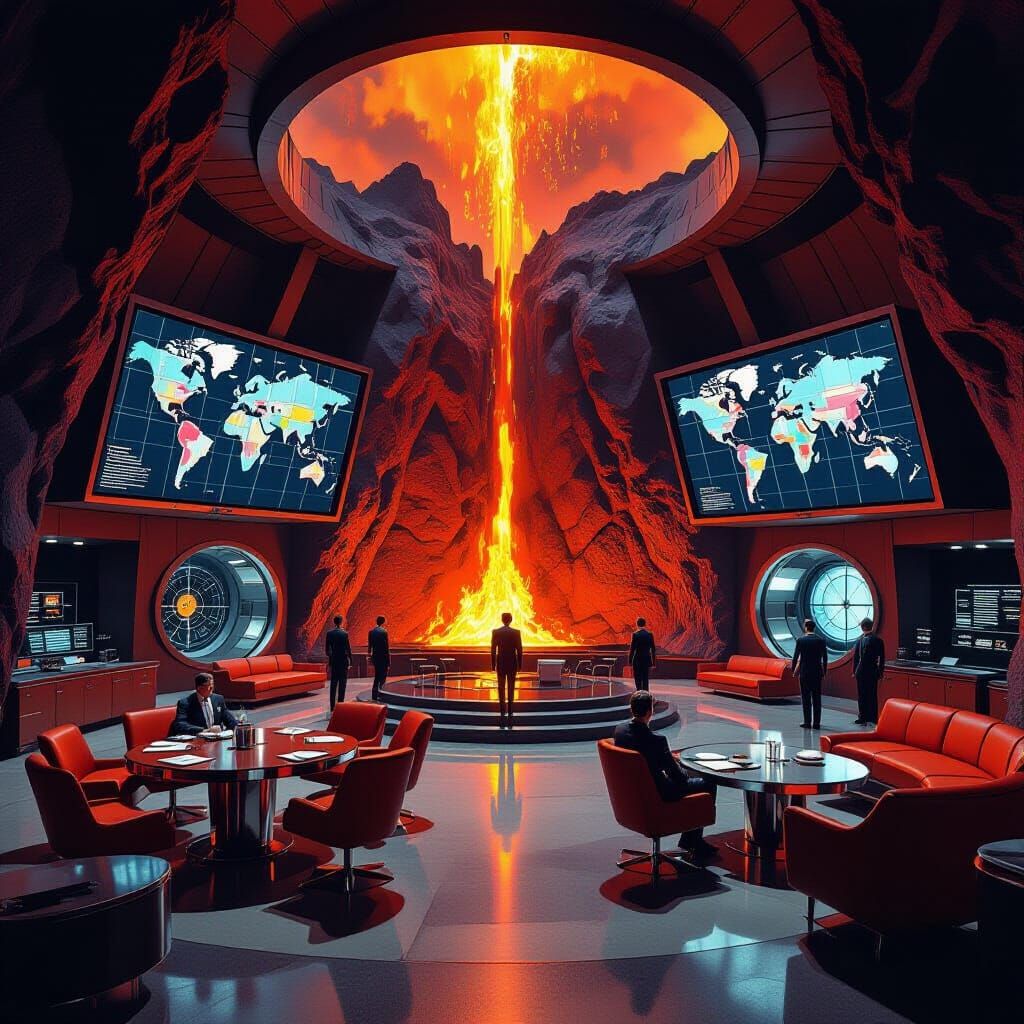 This image depicts a 1960s James Bond-style villain lair within a volcano, featuring mid-century modern design elements, chrome details, and dramatic lava views. Illustrated with cinematic lighting.
