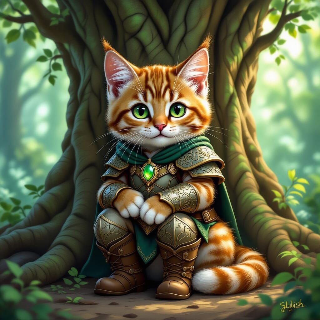 This image shows a cute, anthropomorphic Bengal kitten named Pippin Whiskerstone, wearing jade-adorned armor. He stands by a glowing ancient tree in a dappled, ethereal forest.