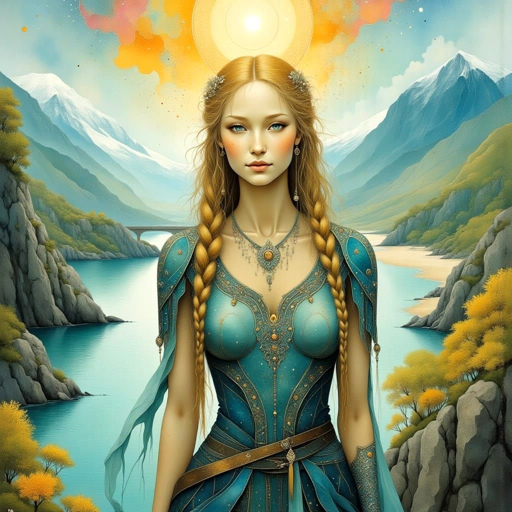 This enchanting image captures a serene female elf against a breathtaking Monet-style backdrop, featuring a soft-focus bridge, rolling hills, and snow-capped mountains, all bathed in warm afternoon light with swirling, magical colors.