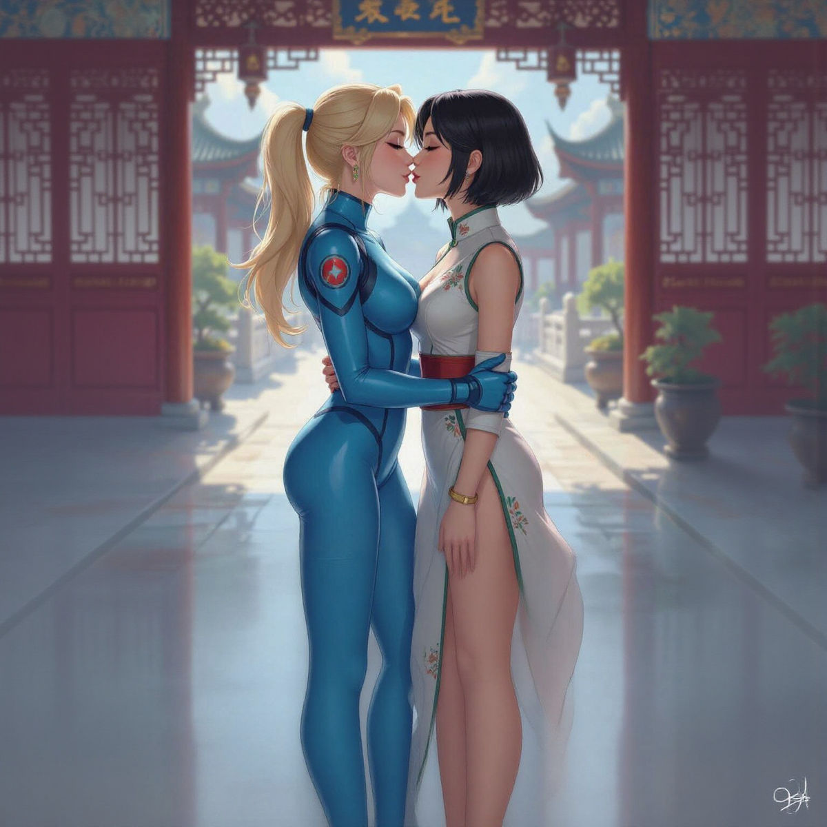 This image shows Samus Aran and Princess Mulan sharing a kiss in a Chinese palace. The scene is rendered in an anime style with soft, ethereal light. The composition and detail are reminiscent of fantasy concept art.