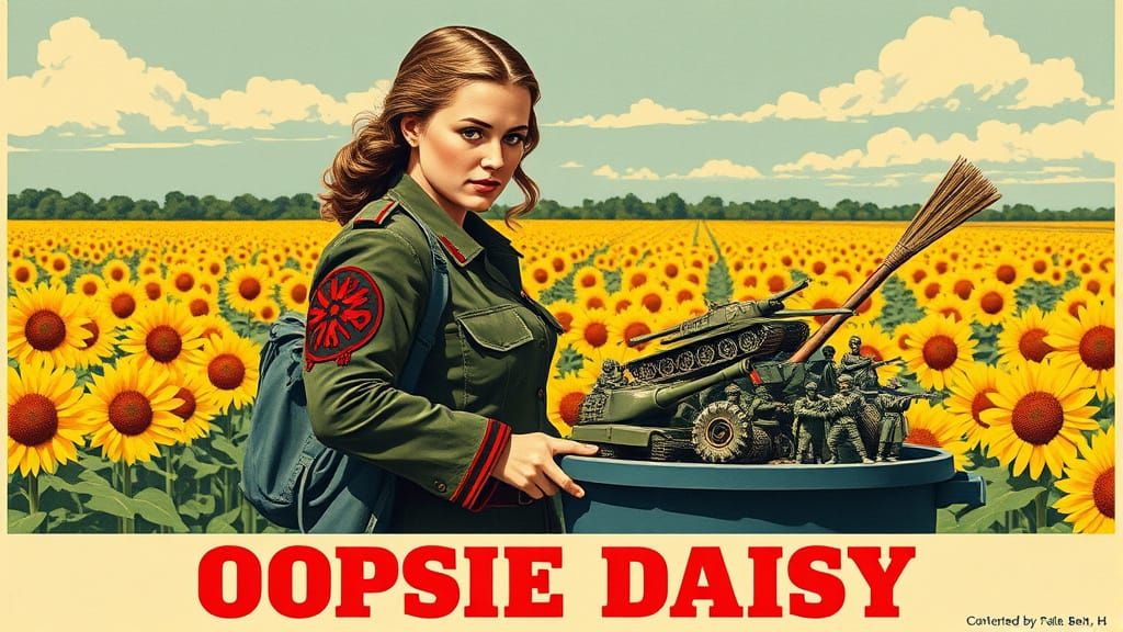 This image shows a Ukrainian woman in combat gear sweeping miniature Russian tanks into a bin. The artwork evokes a vintage linocut print with bold stencil fonts and folk embroidery.