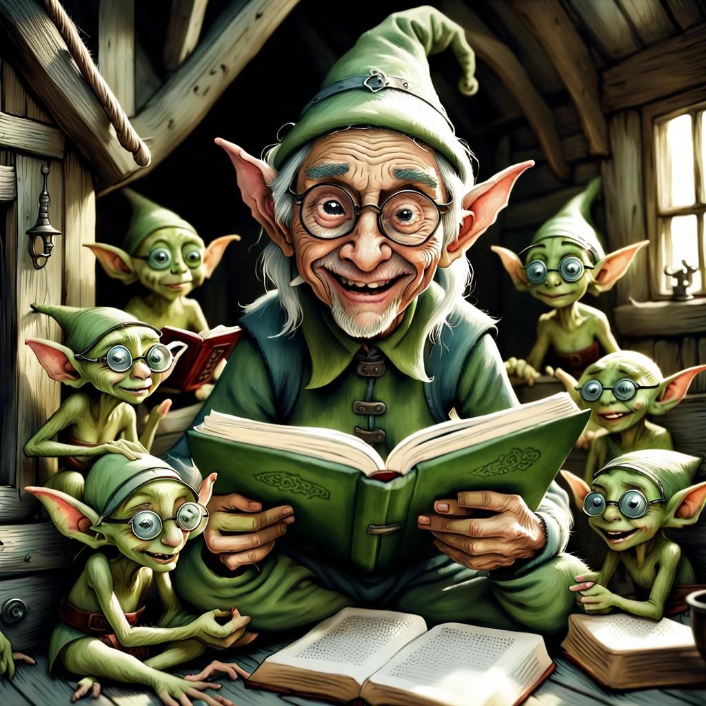 This image shows an elderly elf teaching goblins in a cottage. The artwork features vibrant colors, cluttered bookshelves, and hyper-realistic eyes, rendered in a detailed, ethereal fantasy style.