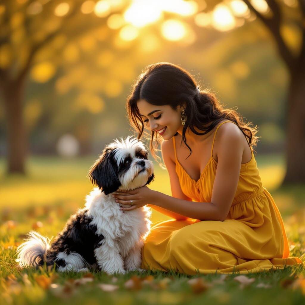 This image shows a South Asian woman in a yellow dress kneeling in a park, nuzzling her Shih Tzu. Soft, warm light illuminates the golden leaves and trees in a cinematic style.
