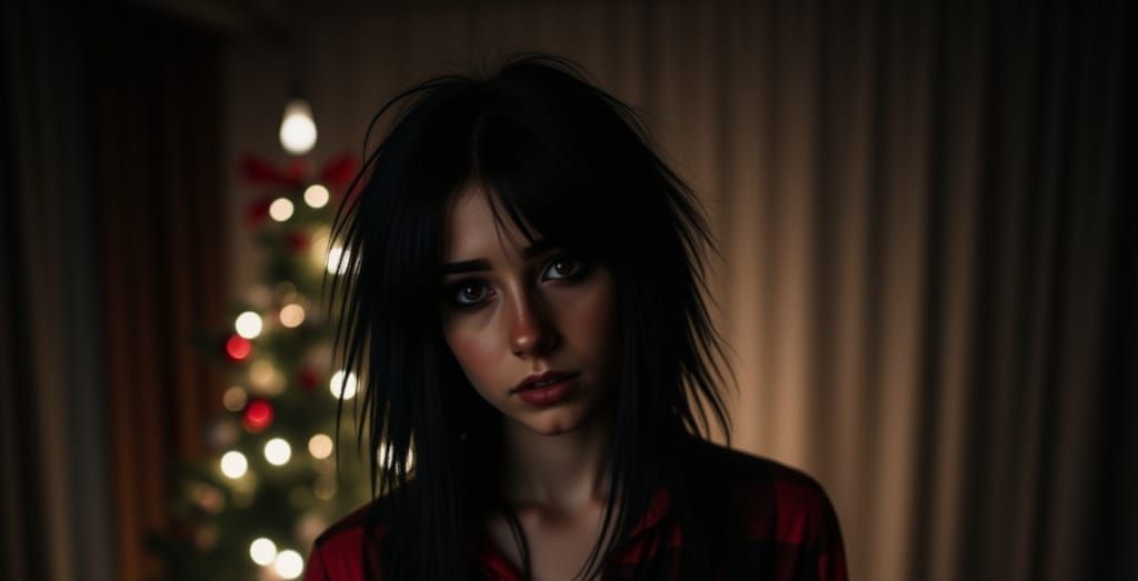 This image features an emo woman in a red and black plaid shirt, bathed in the warm glow of Christmas Eve ambience.