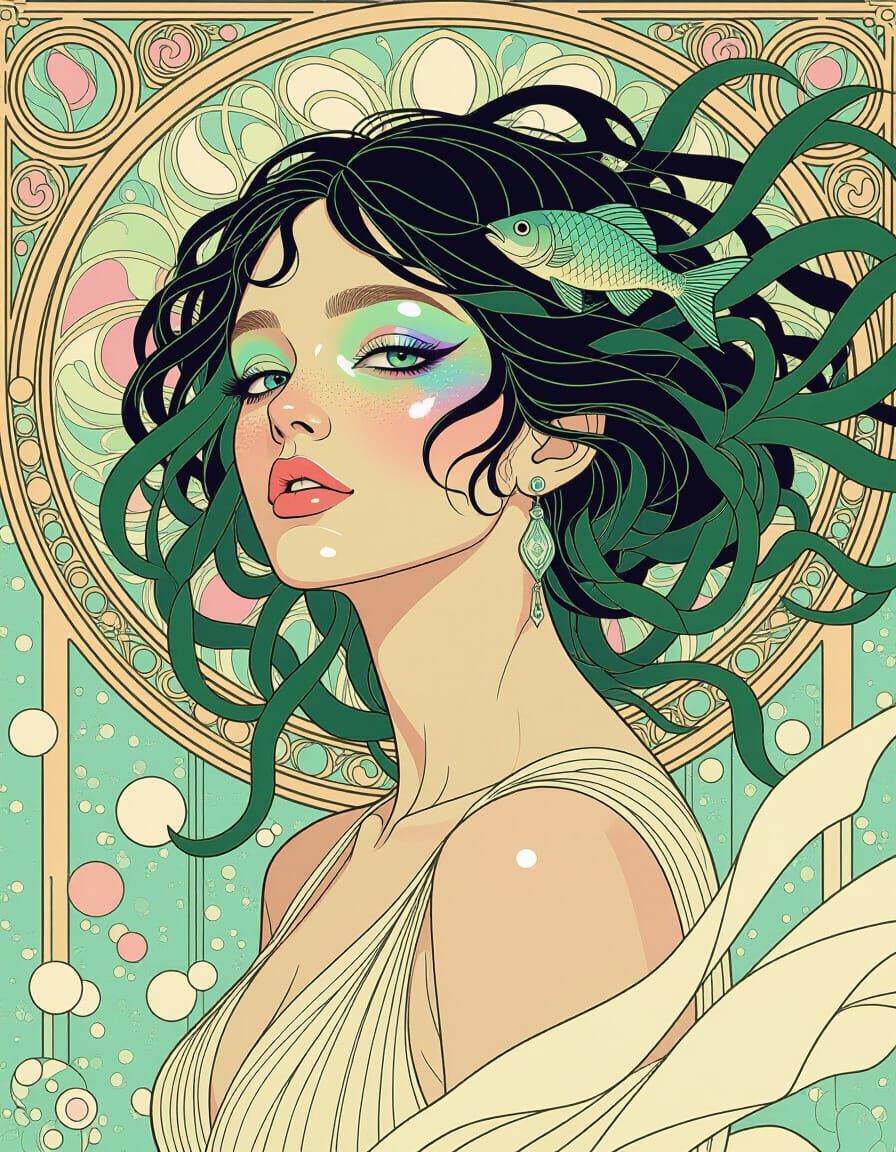 A digital portrait of a woman with seaweed-like hair and fragmented features. The image is filled with glitching shapes and iridescent colors in a cyberpunk aesthetic.