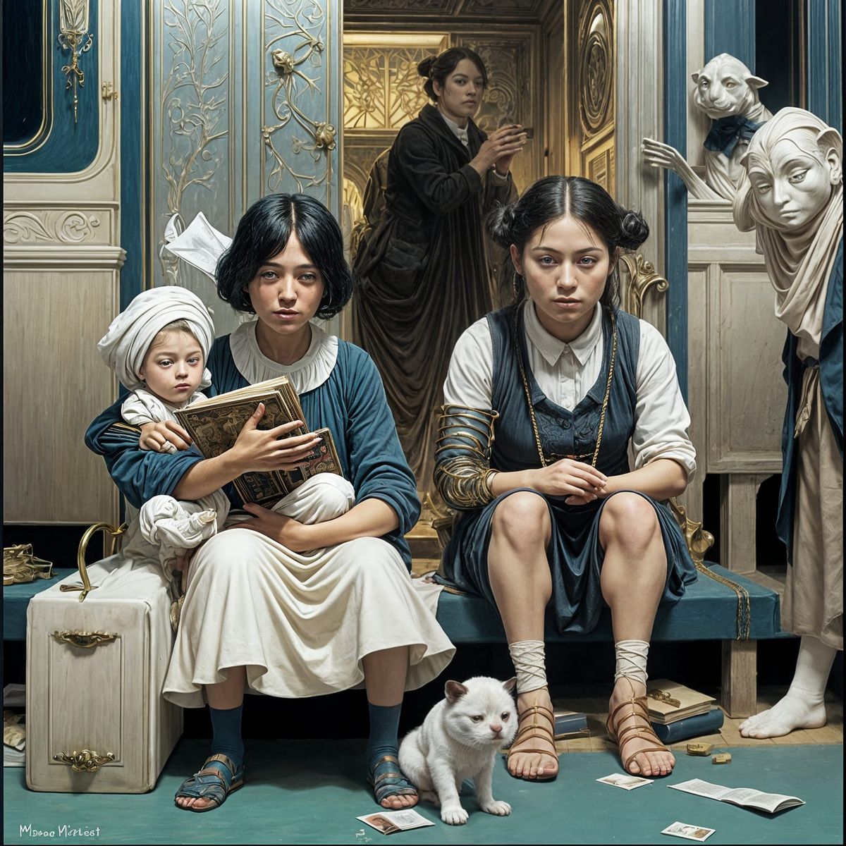 This image depicts a haunting scene of children and babies in peril, rendered in a vibrant palette of complementary colors, characteristic of the Ashcan School style with elements of volumetric lighting and fantastical anatomy.