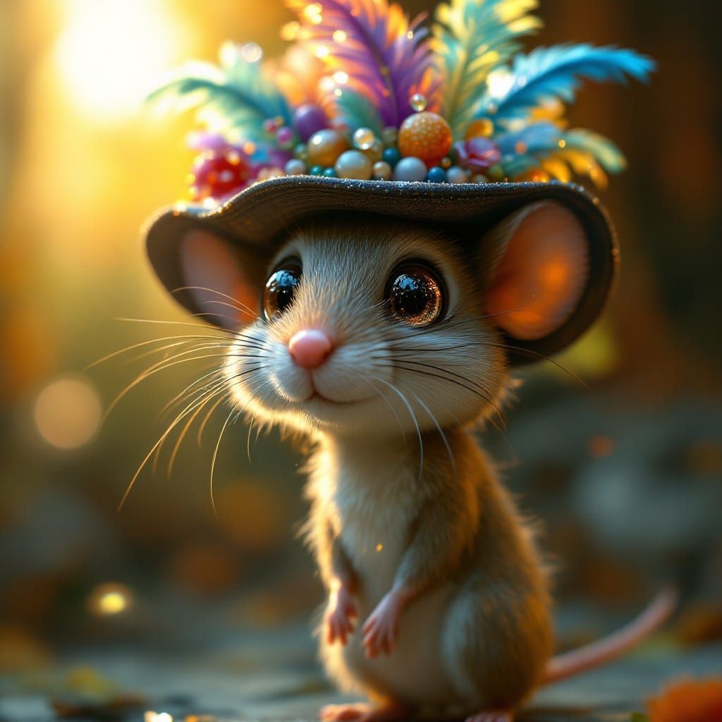 This whimsical image captures a mouse in an extravagant hat, surrounded by warm sunlight and sparkling dew, with vibrant feathers and shimmering eyes, evoking a sense of wonder and enchantment reminiscent of classic Disney and Pixar fairytales.