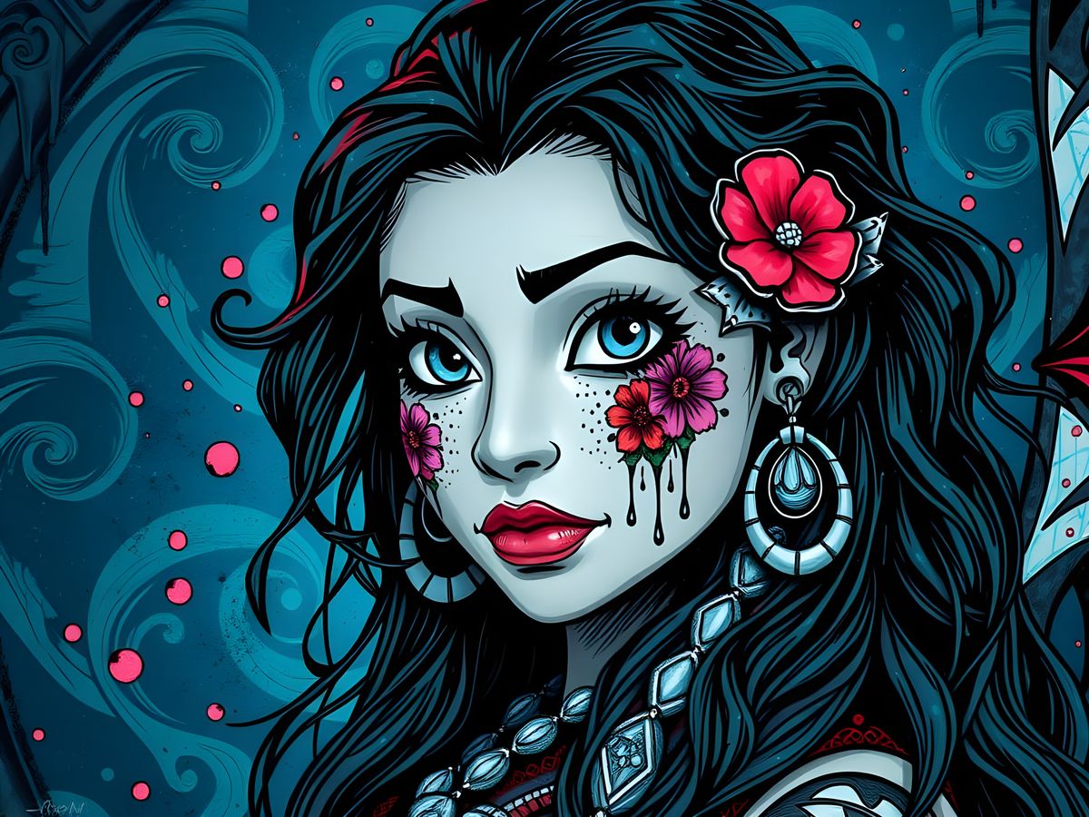 This image features a stunning, intricate calligraphy portrait of Disney's Moana, set against a backdrop of vibrant, pastel colors and eerie, Lovecraftian details, blending traditional and digital art techniques for a truly unique visual experience.