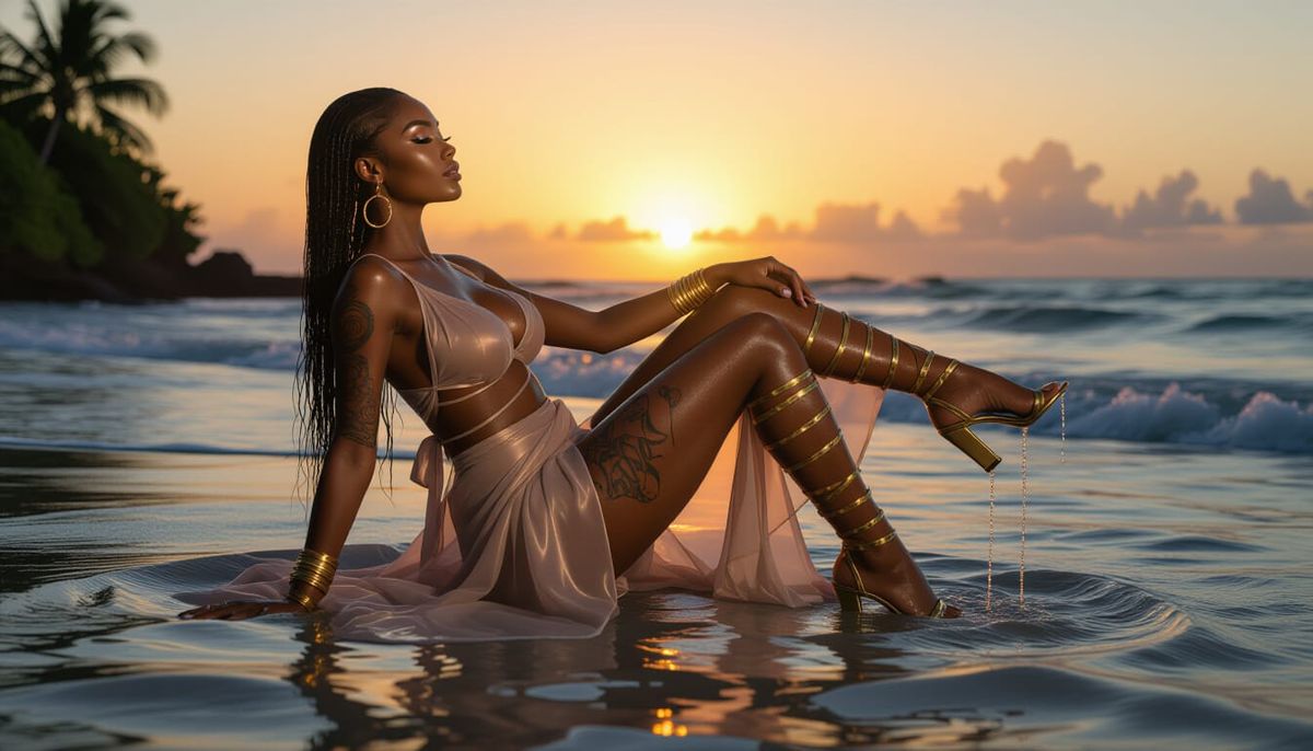 A hyperrealistic portrait of a woman with dark skin standing in shallow water at sunset. She wears a transparent gown, corset, and gold gladiator heels, with tribal tattoos visible on her thigh.