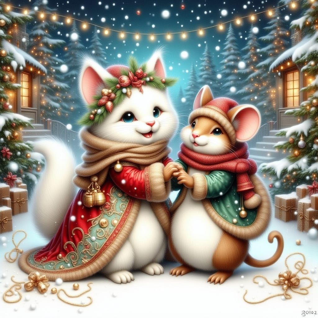A charming illustration of a white cat and a brown mouse in Christmas outfits holding hands outdoors in falling snow. Features vibrant colors and twinkling lights, evoking a storybook feel.