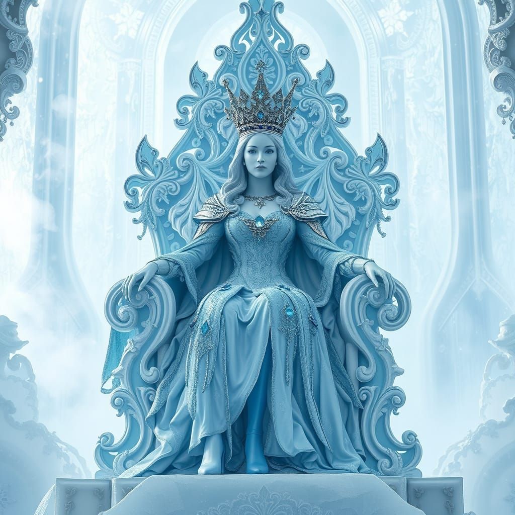 This image depicts a majestic Ice Queen seated on a stunning ice crystal throne, surrounded by swirling ice mist and adorned in shimmering blue, white, and silver attire, evoking a sense of ethereal elegance and subtle mysticism.
