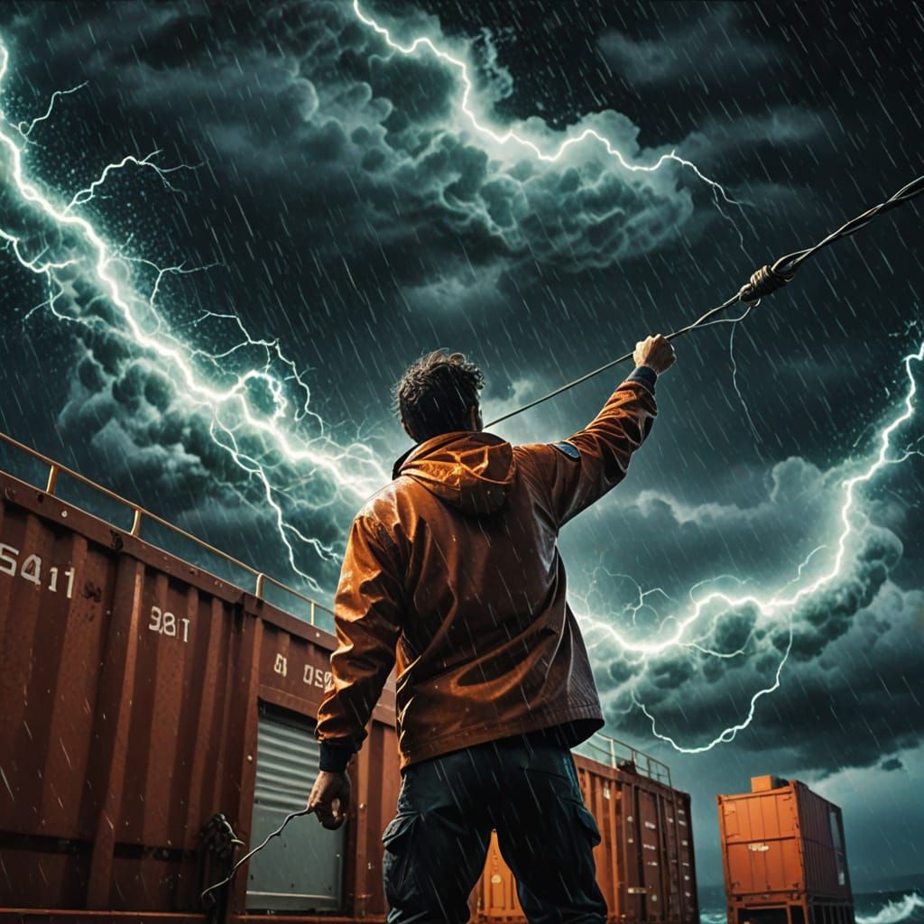 This image shows a man on a container ship during a storm, rendered in a vibrant sci-fi style. Stardust and swirling clouds surround him, with dramatic lightning.