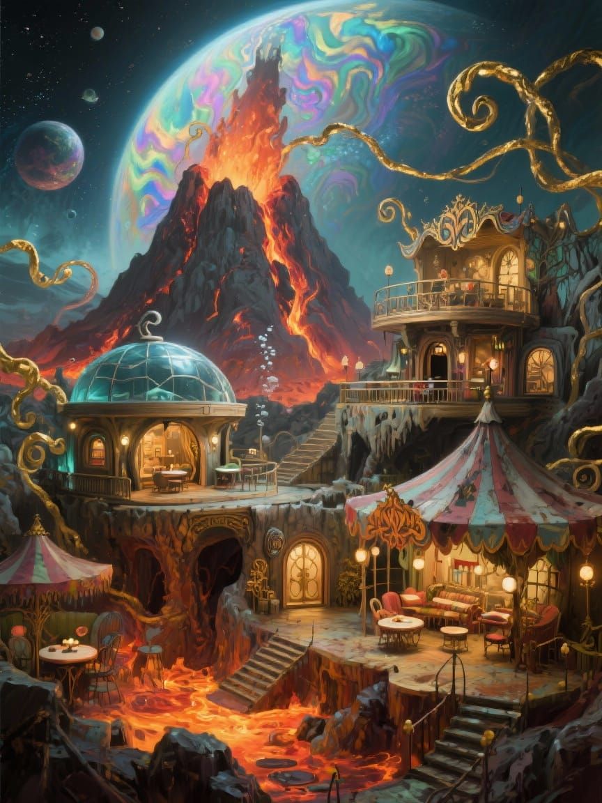 This image showcases imaginative supervillain hideouts: a volcano fortress, underwater dome, penthouse, and carnival, set against a surreal space backdrop in an impasto style.