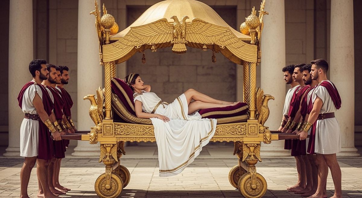 This image shows a Roman Empress resting on a gold litter, surrounded by servants. The scene is lit naturally, with a sharp focus and soft bokeh, reminiscent of classical portrait photography.