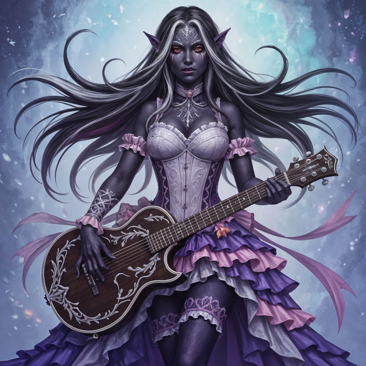 This image shows a female drow bard with striking features and attire. She has dark skin, long hair with silver streaks, and red eyes, dressed in an elaborate outfit while holding a detailed guitar.