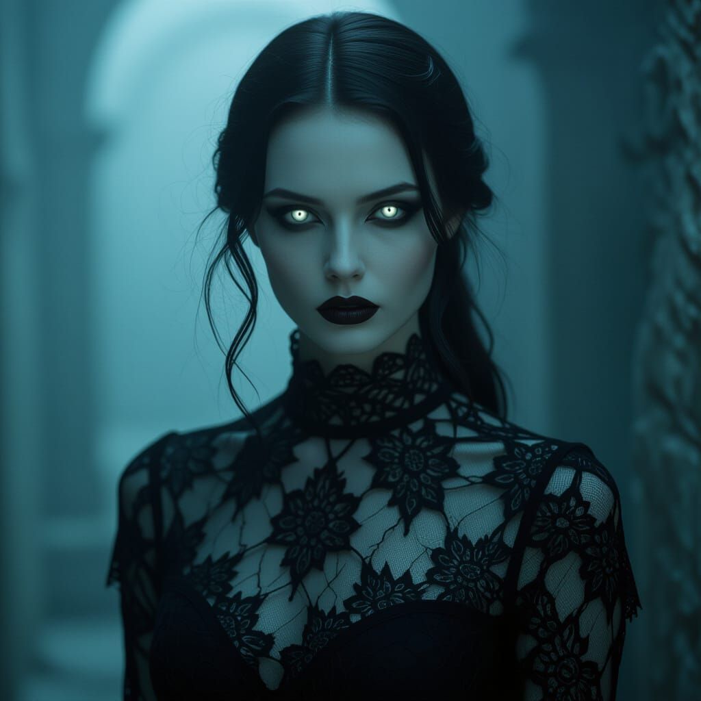 A haunting image of a woman with pale skin and dark lips in a misty environment. She wears a torn lace dress, rendered with high contrast, intricate textures, in a gothic horror aesthetic.