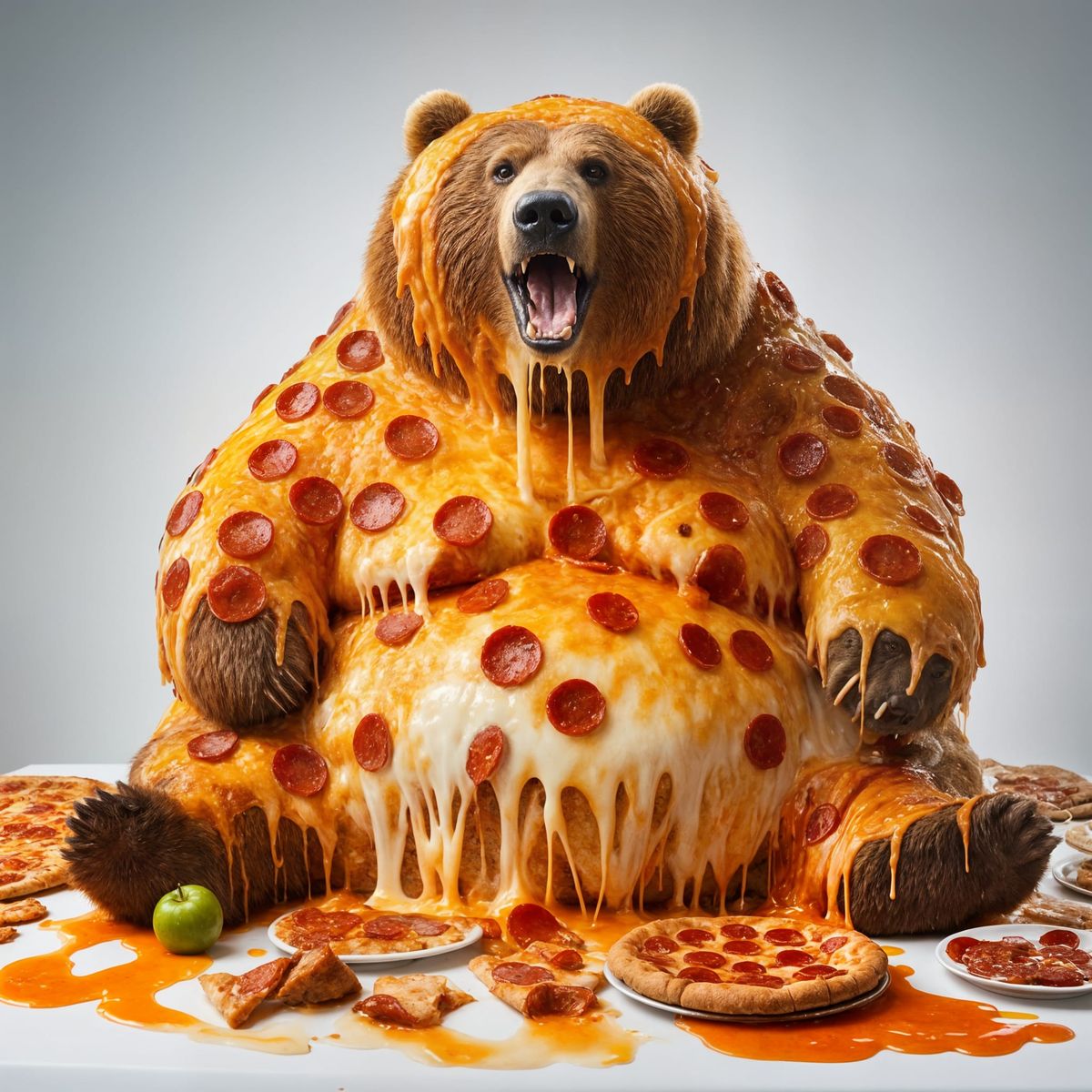 This image shows an obese Kodiak bear covered in melted cheese, pepperoni, and pizza sauce. The surprised bear is entirely covered in pizza, captured in a microphotograph.