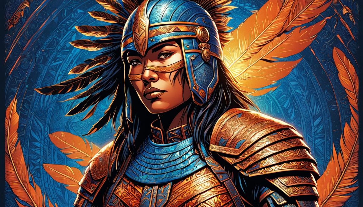 A close-up comic book style image of an American Native warrior woman in leather armor. The digital art features vibrant colors and detailed tribal patterns with golden light.
