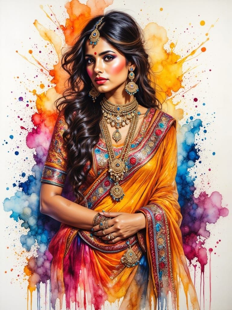 This image showcases a beautiful Indian woman in traditional attire, rendered in a dynamic alcohol ink and watercolor splash style. Features bleeding ink, splotches, and swirls on a white canvas.
