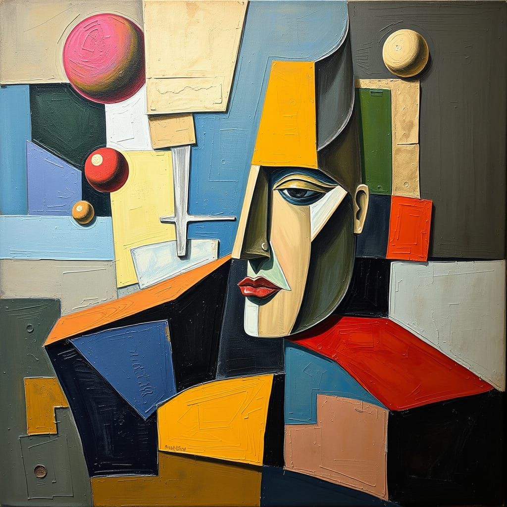 A surreal painting depicting Bernardo de Galvez in an abstract cubist style. The artwork blends recognizable elements with fragmented forms and distorted perspectives.