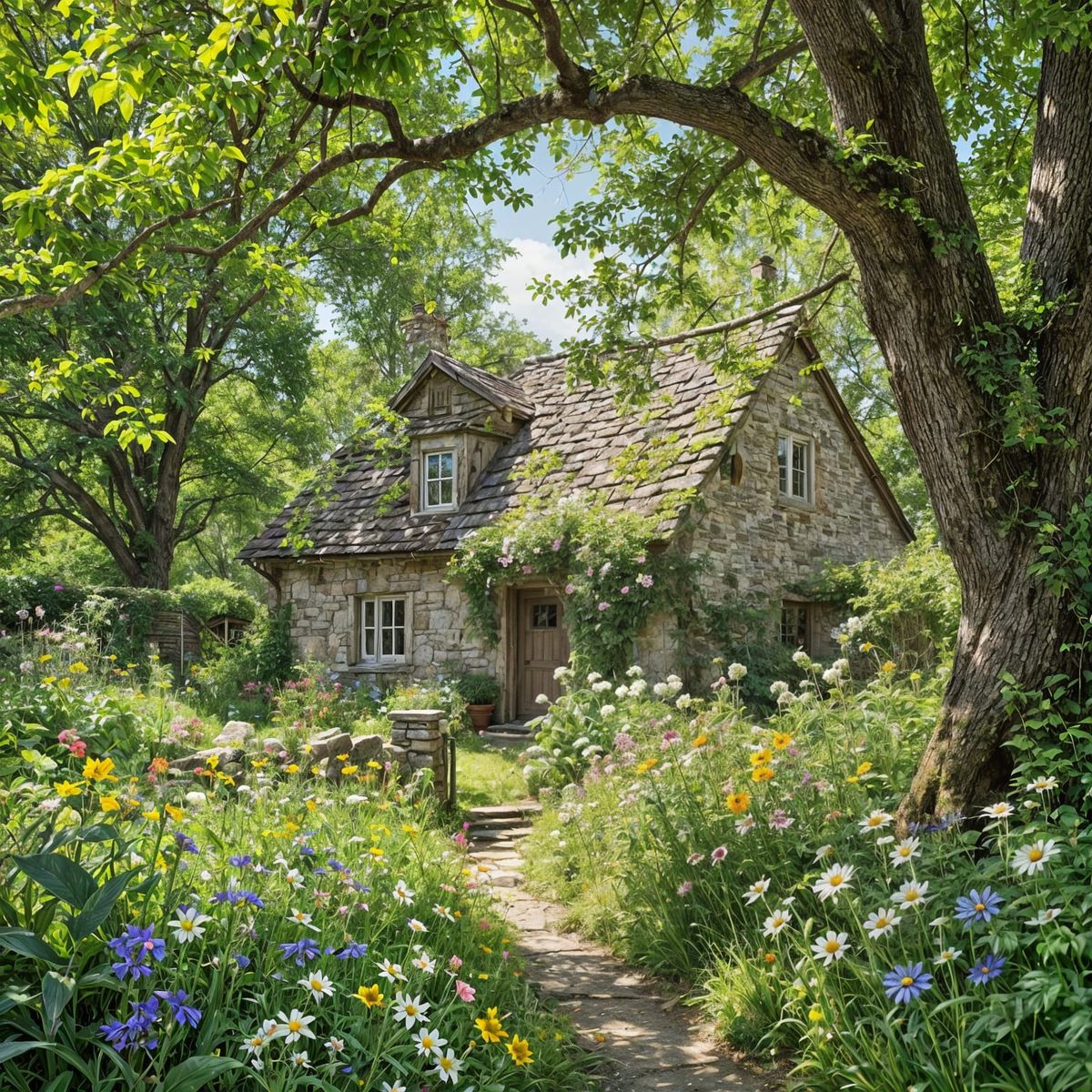 This image features a cozy, rustic cottage surrounded by wildflowers and ancient trees, bathed in dappled sunlight. It evokes a tranquil, painterly atmosphere with soft, natural lighting.