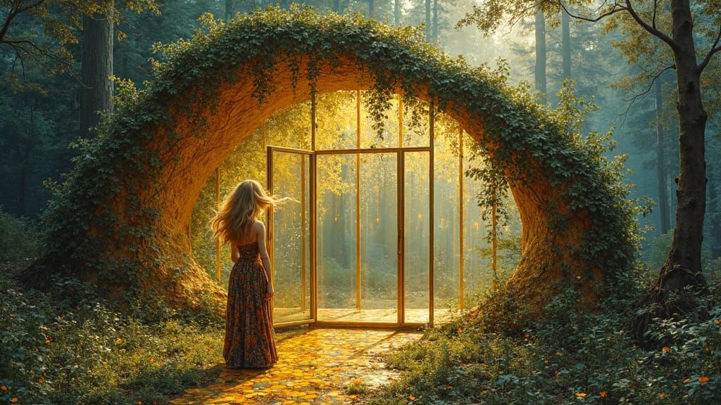 A vibrant image of a woman at the intersection of nature and technology. The art is reminiscent of Klimt, featuring ornate details, symbolic elements, and a luminous color palette.