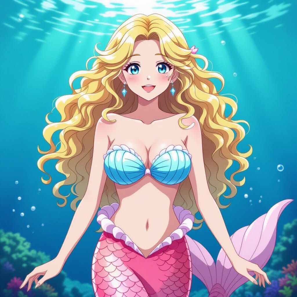 This image shows a blonde anime-style mermaid with a pink tail and blue seashell bra, underwater. The artwork features vibrant colors and a stylized aesthetic, reminiscent of popular anime art.