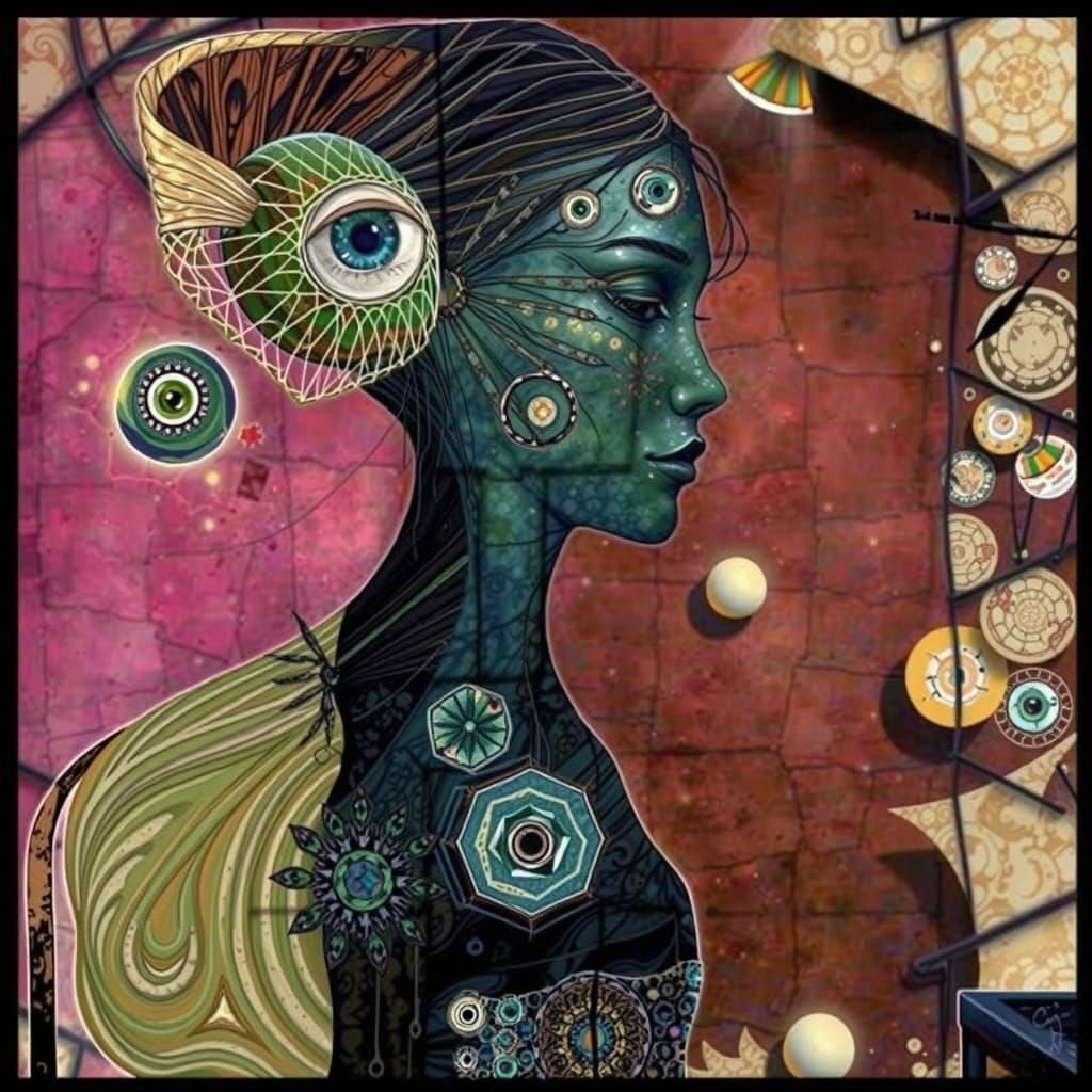 This image depicts a stunning woman playing piano in a multicolored, intricate, and maximalist art style, blending elements of fractal synapses and bioluminescent beauty.