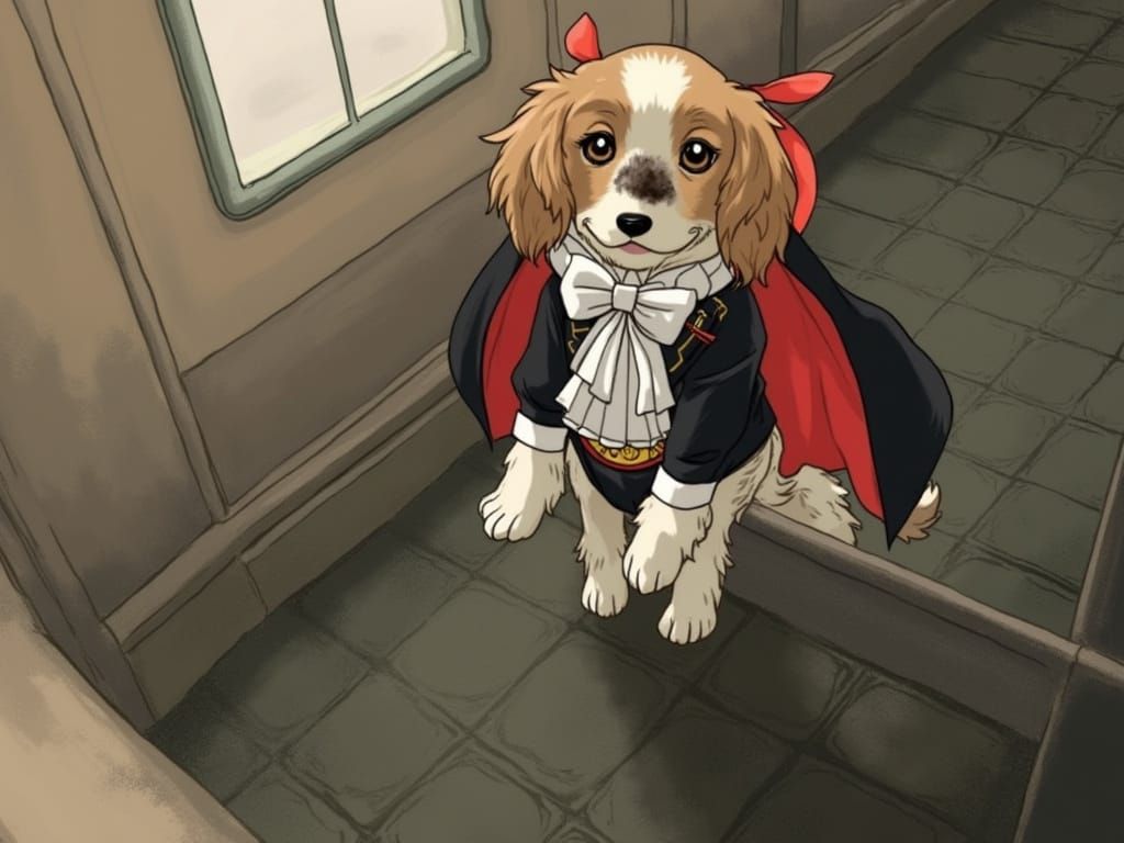 A vibrant anime-style image of a Cavalier King Charles spaniel dressed as Dracula, complete with a cravat and hat. The artwork features dynamic lines and a bright color palette.